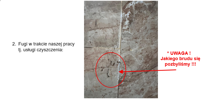 Profesjonalnie dobierzemy właściwy środek czyszczący, który  pozwoli usunąć najbardziej uporczywe zabrudzenia z fug.  Dodatkowo usuniemy grzyby, bakterie i zarazki, które przez lata gromadzą się w szczelinach, zwłaszcza posadzek z fugami cementowymi.